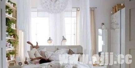 这是一款纯净而浪漫的卧室。大吊灯仿佛簇拥的白色花团,飘逸唯美的白色幔帐让卧室显得更为隐秘撩人。靠墙一整排的架子上摆满了绿色可人的小植物,大有把户外花园移景入室的美感。